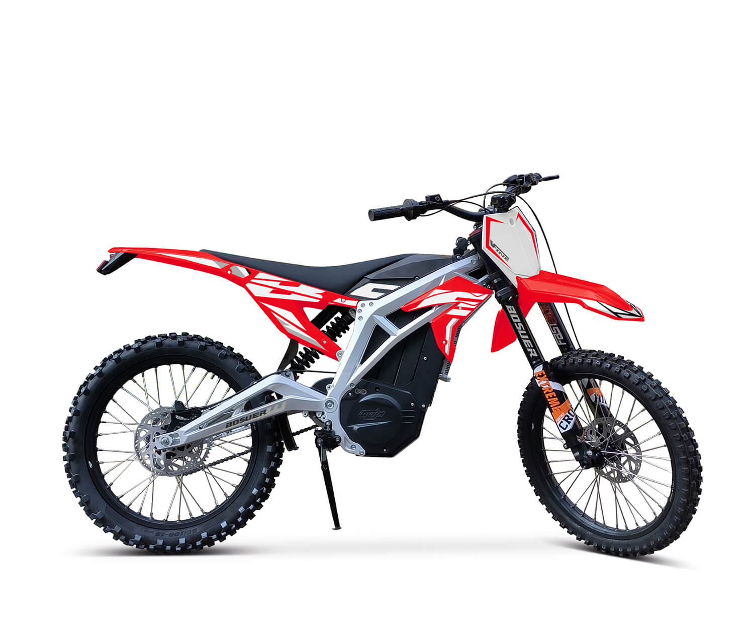 This Bosuer Extreme Cruiser electric dirt bike boasts a bold red body with white accents, rugged off-road styling, sleek aggressive lines, wide knobby tires, and a sturdy aluminum frame—ideal for thrill-seekers. The image highlights the “Extreme Cruiser” branding on the front fork, evoking a stylish, durable beast ready to charge.